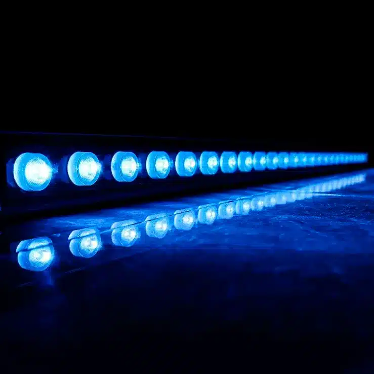 Bañador de pared rígido de 22W y 24V, con tecnología RGBW que combina luz blanca cálida (2700K) con ajuste dinámico de color, ideal para crear efectos luminosos versátiles y adaptar la atmósfera a cada entorno. Perfecta para resaltar fachadas y detalles arquitectónicos con precisión gracias a su ángulo de apertura estrecho de 12°. Diseñado para uso exterior con protección IP65, resiste la exposición al polvo y a salpicaduras de agua. Mide 556 mm de largo. Cuenta con regulación total de intensidad mediante sistema de control PWM compatible con 1-10 V, DALI, Bluetooth, DMX y WIFI, y garantía de 3 años. Driver no incluido. Certificado CE y RoHS.