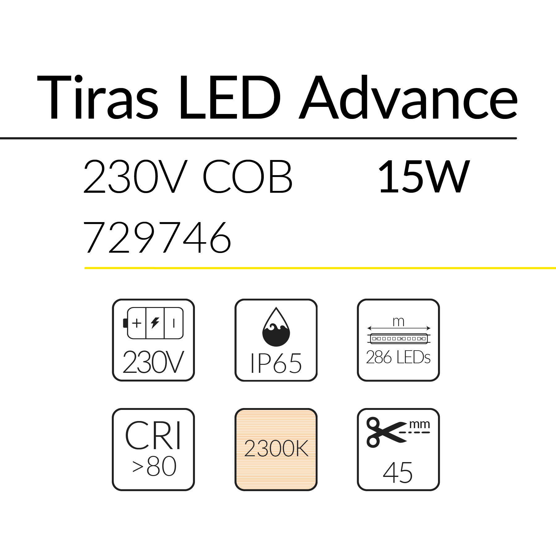 Tira LED ADVANCE COB de BLUELed, con una potencia de 15W/m y operando directamente a 230V, emite una luz blanca muy cálida de 2300K. Es ideal para crear ambientes extremadamente cálidos y acogedores, con un efecto similar a la luz de una vela o un fuego suave. Gracias a su robusta clasificación IP65, está diseñada para uso en exteriores o ambientes húmedos, siendo resistente al polvo y a chorros de agua. Es completamente regulable en intensidad, cuenta con una sólida garantía de 3 años. No requiere un driver externo, lo que simplifica su instalación.