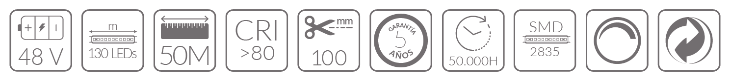 Estas tiras cuentan con una vida útil media excepcional de 50.000 horas (L70B50), garantizando un rendimiento muy prolongado. Se ofrecen en rollos de hasta 50 metros, lo cual facilita su instalación en proyectos de gran envergadura. Requieren un driver o fuente de alimentación de 48V y se recomienda el uso de perfiles de aluminio para una óptima disipación del calor y mayor durabilidad.